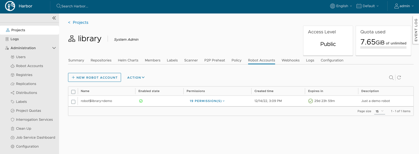 You are only able to see project robot accounts from this page. Harbor administrators can also see system robot account information on the System Robot Account page.